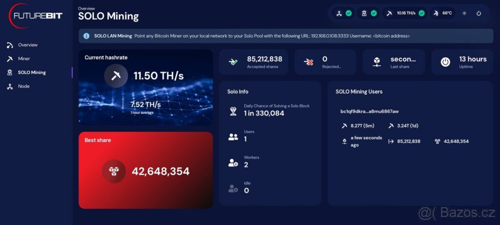Jednou z nejvýznamnějších vlastností je možnost spuštění plného Bitcoinového uzlu přímo na zařízení. S 4 GB RAM a až 2 TB NVMe úložiště máte k dispozici vše potřebné pro běh uzlu. Apollo II je navíc primárně zaměřen na solo těžbu, což znamená, že můžete těžit Bitcoiny bez nutnosti připojení k velkým těžebním poolům. Tím podporujete decentralizaci Bitcoinové sítě. Výhodou je, že Apollo II je kompletní node s operačním systémem a integrovaným mining polem, což zjednodušuje celý proces těžby a zvyšuje vaši nezávislost.