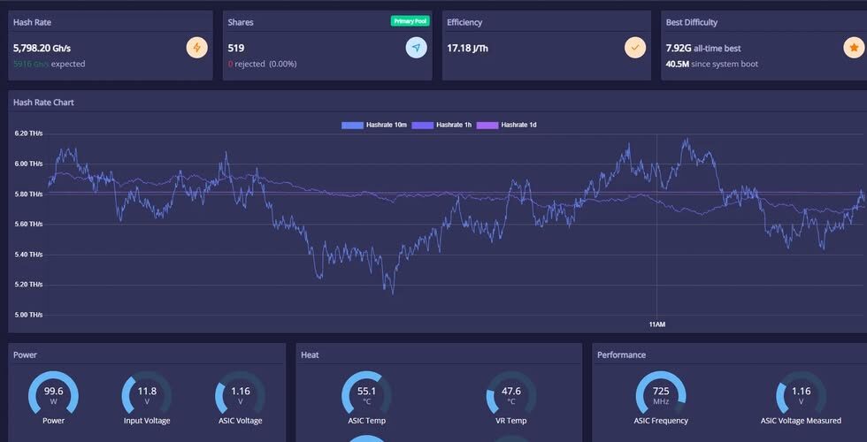 Pojďme k tomu nejdůležitějšímu: výkon a spotřeba. NerdQaxe++ nabízí stabilní hashrate v řádu stovek GH/s (konkrétní hodnota závisí na přesném modelu a nastavení), což je na takového prcka úctyhodné. Ale skutečná magie se skrývá ve spotřebě. S pouhými 5-10 watty spotřebuje méně energie než většina LED žárovek. Můžete ho nechat běžet 24/7 napájený z obyčejného USB-C portu a na ročním vyúčtování elektřiny to prakticky nepoznáte.
